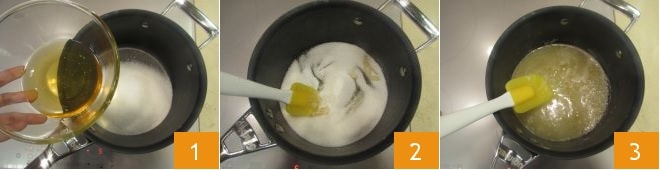 Para preparar el panforte, lo primero que debes hacer es verter en un cazo el azúcar y la miel 1; luego mezcla 2 hasta que se disuelva 3.