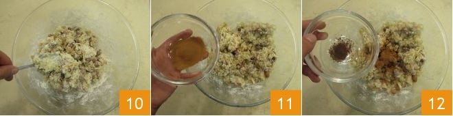 continuando a mezclar con una cuchara 10. No te preocupes si la masa resulta demasiado densa, es normal. En este punto, añade la pizca de canela 11, los clavos de olor finamente molidos 12, el cilantro