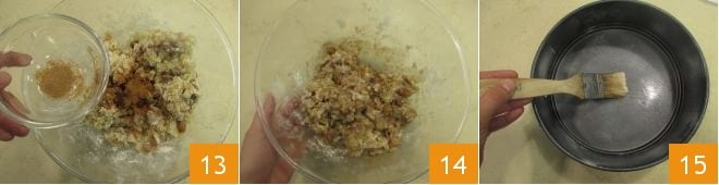 y la nuez moscada en polvo 13. Mezcla nuevamente todo, a mano si te resulta más cómodo, para amalgamar bien los ingredientes 14; tendrás que trabajarlo con bastante energía. En este punto, unta con mantequilla un molde desmontable de 20 cm de diámetro 15