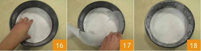 y coloca la oblea en el fondo 16. Luego recorta una tira de papel de horno, del grosor del molde y de la misma longitud de la circunferencia: utilízala para revestir toda la circunferencia del molde (17-18).