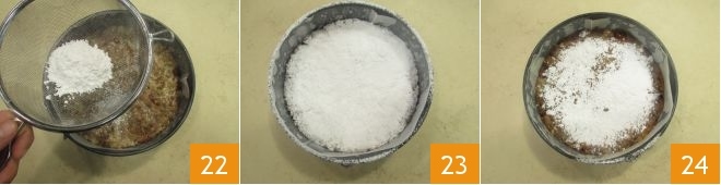 Espolvorea el panforte con aproximadamente 10 g de azúcar glas (22-23), debe quedar perfectamente cubierto. Cocina en horno estático precalentado a 220° durante aproximadamente 10 minutos. Pasado este tiempo, retira el panforte del horno 24 y deja que se temple solo unos minutos; no debe estar frío porque de lo contrario no podrás desmoldarlo.
