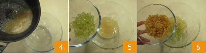 En este punto, transfiere a un bol de pyrex 4. Añade tanto el cidro confitado 5, como la naranja confitada 6