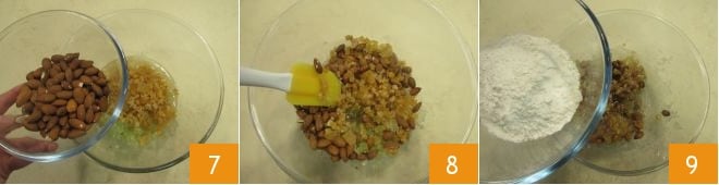 y las almendras 7. Mezcla todo 8, luego incorpora también la harina 9
