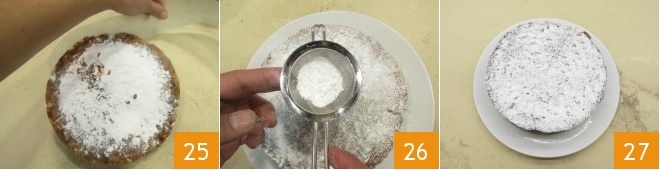 Después de eso, desmolda el panforte 25, quita el papel de horno y espolvorea nuevamente con el azúcar glas 26, antes de servirlo 27.