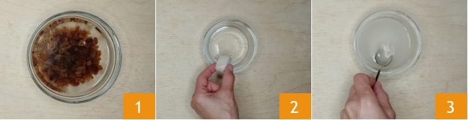 Para realizar el pangiallo romano, primero deje ablandar las pasas en 300 g de agua tibia durante 30 minutos 1, luego escúrralas del exceso de agua. Disuelva 10 g de levadura de cerveza en 40 g de agua tibia 2 mezclando con una cucharita 3.