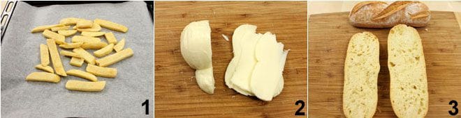 Para preparar el bocadillo de salchicha y patatas fritas, empieza cubriendo una bandeja con papel de horno, coloca las patatas fritas 1 y hornéalas durante unos 15 minutos a 200°C, cuando estén listas échales sal. Mientras tanto, corta la scamorza en lonchas muy finas 2 y el pan a la mitad a lo largo 3,