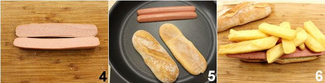 corta también la salchicha a lo largo 4. Calienta una sartén antiadherente y coloca en ella el pan (con la parte cortada hacia abajo) y la salchicha 5. Cocina durante unos 5 minutos, dando la vuelta a la salchicha a mitad de cocción. Luego comienza a montar el sándwich: cubre el pan con las lonchas de scamorza que se derretirá al contacto con el pan caliente, añade la salchicha y coloca encima las patatas fritas 6, espolvorea con ketchup o mayonesa (lo que más te guste) y cierra con la otra mitad del pan.