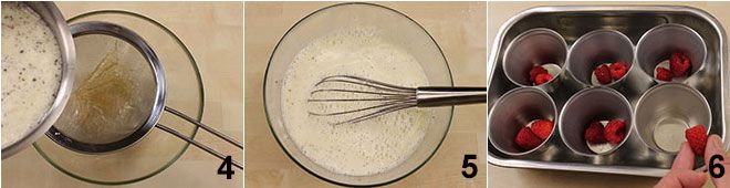 Cuando la nata haya alcanzado la temperatura, retira la cacerola del fuego, filtra la nata caliente con un colador de malla fina para eliminar los trozos de vainilla y viértela sobre el bol donde se encuentra la gelatina escurrida 4. Mezcla bien para disolver la gelatina 5 y si es necesario, lleva la mezcla nuevamente al fuego por unos minutos. Prepara 6 moldes con un diámetro de 8 cm y una capacidad de aproximadamente 120 ml y coloca en el fondo 2 frambuesas, lavadas y secas 6 y