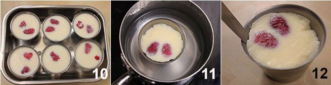 vierte en el molde la primera capa de panna cotta que cubrirá las frambuesas hasta la mitad de su altura 7. Deja que la primera capa se solidifique en el frigorífico durante aproximadamente 1 hora o en el congelador durante 30 minutos; mientras tanto, cubre la mezcla restante con una capa de film, haciendo un pequeño agujero en la superficie para que pase el aire y mantenla a temperatura ambiente, alejada de fuentes de calor, mezclando con el batidor de vez en cuando. Pasado el tiempo indicado, coloca otras dos frambuesas dentro del molde 8 y cubre con la segunda capa de panna cotta 9.