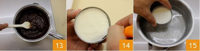 Cuando el chocolate se haya derretido, apaga el fuego y deja templar mezclando de vez en cuando 13. Pasado el tiempo de solidificación de 3 horas, saca la panna cotta de coco del frigorífico y desmóldala introduciendo la hoja de un cuchillo de hoja lisa por el perímetro de la misma 14 y luego sumergiendo el molde durante unos segundos en agua hirviendo deteniéndote a 2-3 mm del borde 15.