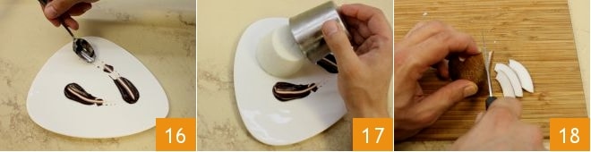 En este punto, pasa al emplatado; con el dorso de una cuchara decora como más te guste el plato de servir con la salsa de chocolate que has preparado 16, luego desmolda la panna cotta en el plato 17 (si es necesario, da unos pequeños golpecitos para que salga). A continuación, con un cuchillo corta el coco en rodajas finas 18;