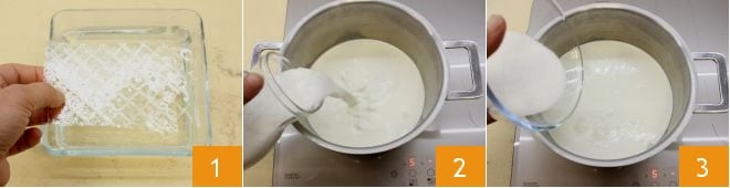 Para preparar la panna cotta de coco con salsa de chocolate, primero comienza por poner a remojo la gelatina en hojas en un recipiente con agua fría 1, dejándola ablandarse completamente durante al menos 10 minutos. Mientras tanto, en un cazo calienta a fuego bajo, pero sin dejar que hierva, la nata junto con la leche de coco 2 y el azúcar 3, mezclando bien con las varillas.
