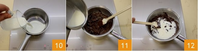 Mientras tanto, en un cazo calienta la nata fresca 10 y, cuando el chocolate empiece a derretirse, añádela al baño maría 11, mezclando con una cuchara de madera 12 para que el chocolate se derrita completamente.