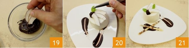 toma 3 rodajas e introduce la punta en la salsa de chocolate 19, luego termina colocándolas sobre la parte superior de la panna cotta 20 y añadiendo también dos hojitas de menta (si lo deseas, puedes decorar más con la salsa que te haya sobrado). Finalmente, sirve la panna cotta de coco con salsa de chocolate 21.