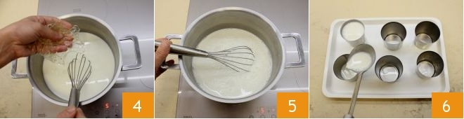 Una vez que la mezcla haya alcanzado el punto de ebullición, apaga el fuego, espera un momento y exprime bien la gelatina en hojas antes de añadirla a la mezcla 4, mezclando bien hasta que se haya disuelto completamente 5 (si hubiera grumos, pásalo todo por un colador de malla fina). En este punto, prepara en una bandeja 6 moldes con capacidad de 150 ml, mojando el interior con agua (esto te servirá para poder desmoldar mejor la panna cotta una vez solidificada) y luego con un cucharón vierte la panna cotta llenándolos hasta el borde 6.