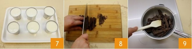 Una vez terminada esta operación 7, mete la panna cotta de coco en el frigorífico a solidificar durante al menos 3 horas. Media hora antes de servir la panna cotta, prepara la salsa de chocolate: con un cuchillo, pica el chocolate negro 8 y luego ponlo al fuego en un recipiente al baño maría 9, asegurándote de que el agua de abajo no esté en contacto directo con el fondo del recipiente.