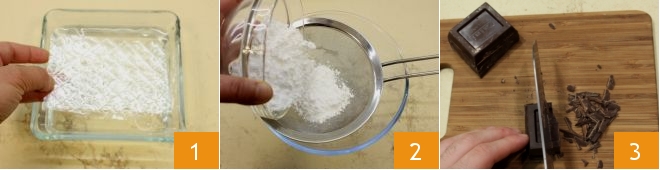 Para preparar la panna cotta de chocolate, comienza con la panna cotta: remoja las hojas de gelatina en un bol con agua fría 1, durante al menos 10 minutos. Tamiza el azúcar glas 2 y pica el chocolate negro 3.