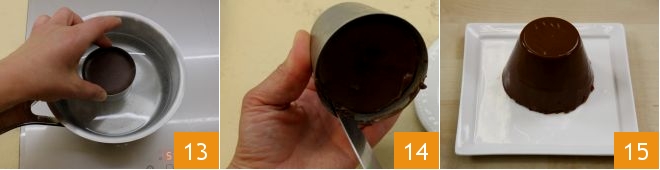 Pasado el tiempo de enfriamiento, extrae las pannacotte de los moldes: para facilitar la operación puedes sumergir por unos instantes los moldes en agua hirviendo 13; luego pasa la hoja de un cuchillito alrededor del borde 14, invierte para desmoldar 15. Decora entonces la panna cotta de chocolate con la salsita de mango, unas hojitas de menta y eventualmente mango en cubitos.