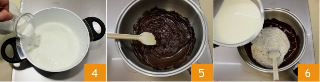 Calienta la nata en una cacerola 4, mientras derrites el chocolate al baño maría, poniéndolo en un bol o colocando un cazo dentro de otro recipiente lleno de agua, de tal manera que el agua no toque el recipiente donde has puesto el chocolate. Remueve para que se derrita completamente 5, luego añade la nata calentada por separado 6