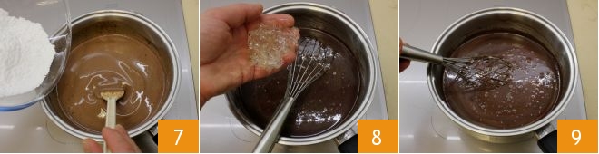 y el azúcar glas tamizado 7. Continúa removiendo con una espátula y calienta todo a fuego bajo sin llegar nunca a hervir y sigue removiendo para que el chocolate no forme grumos. Escurre bien las hojas de gelatina y añádelas a la mezcla 8, luego mezcla con un batidor hasta que se disuelvan completamente 9.