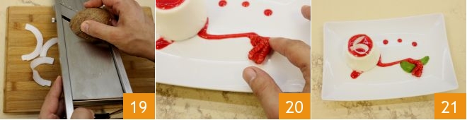 con la mandolina corta finamente el coco 19 y completa decorando con una frambuesa 20, un par de hojas de menta y las finas rebanadas de coco 21; una vez terminado, sirve inmediatamente la panna cotta de coco con coulis de frambuesas.