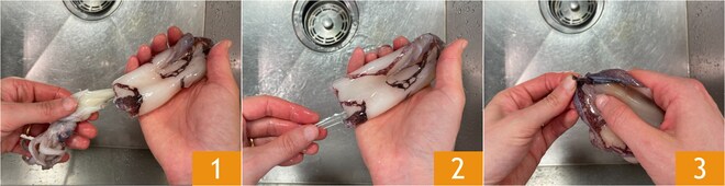 Para preparar la panzanella de mar, lo primero es dedicarse a la Cómo limpiar los calamares: desprende delicadamente la cabeza del manto 1, luego extrae la pluma de cartílago que se encuentra en el interior 2. Enjuaga bajo agua corriente y ayúdate con las manos para eliminar las vísceras que se encuentran en el manto. Haz una incisión con un cuchillo en la parte final del manto y elimina la piel externa 3. En este punto, corta los mantos en rodajas de aproximadamente 2 cm de ancho. Retoma la cabeza y corta justo debajo de los ojos, luego reserva los tentáculos junto al manto cortado.