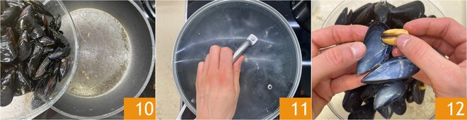 Pon los mejillones en la misma sartén en la que has cocido las gambas y los calamares 10, luego cubre con la tapa 11 y cocina a llama media. Después de un minuto comenzarán a abrirse, así que sácalos de la sartén a medida que se abran. Filtra el fondo de cocción y separa el fruto de la concha 12. Reserva.