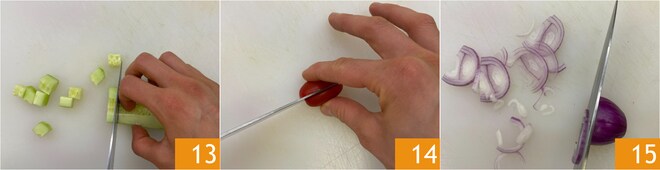 Ahora ocúpate de las verduras: pela los pepinos y córtalos en cubitos de aproximadamente 2 cm 13. Divide los tomatitos a la mitad 14 y corta la cebolla en rodajas finas 15.