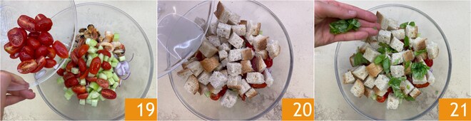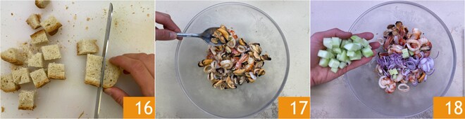 Finalmente reduce el pan en cubos de aproximadamente 3 cm 16. Estás listo para ensamblar el plato: en el bol con las gambas y los calamares añade los mejillones 17, la cebolla y los pepinos 18.