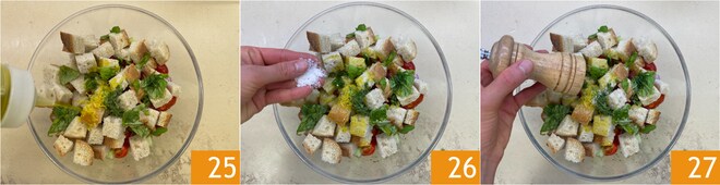 Completa con un chorrito de aceite 25 y ajusta de sal 26 y pimienta 27.