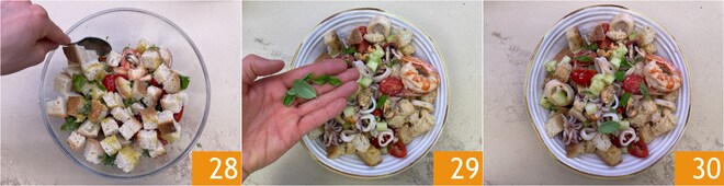 Mezcla bien para amalgamar todos los ingredientes 28. Emplata y completa con algunas hojitas de albahaca 29. ¡Tu panzanella de mar está lista para ser servida 30!