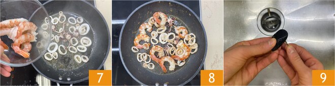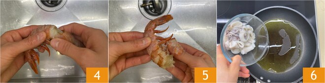 Pasa a la Cómo limpiar los gambones: separa la cabeza 4, luego elimina el caparazón 5 y el intestino que se encuentra en el dorso de la gamba. En una sartén calienta un chorrito de aceite, luego añade los calamares 6 y cocina a fuego alto durante 3 minutos.