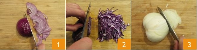 Para preparar la panzanella invernal, primero limpia y corta finamente la cebolla roja 1. Corta también en tiras finas el repollo rojo después de haber eliminado las hojas más externas y el tronco central 2, procede de la misma manera con los hinojos 3.
