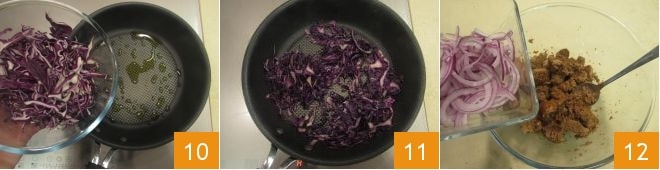 Reserva la calabaza y en la misma sartén calienta un poco más de aceite, esta vez agrega el repollo rojo 10 y saltéalo durante 5 minutos 11. En este punto, retoma el pan remojado y añade todos los ingredientes preparados: la cebolla 12,