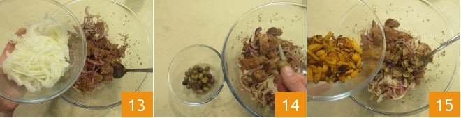 los hinojos 13, las aceitunas, con cuidado de deshuesarlas con un cuchillo pequeño 14, finalmente añade también la calabaza 15 y el repollo salteados en sartén.