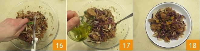 Aromatiza con los tallos de cebollino cortados en trocitos 16, adereza con aceite 17, sal y pimienta al gusto. ¡Tu panzanella invernal está lista para ser degustada 18!