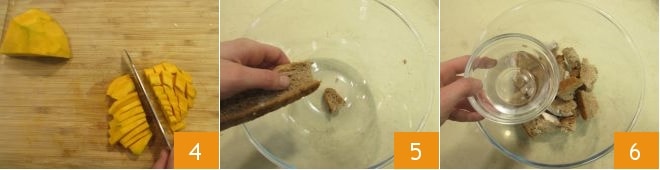Pela la calabaza y córtala en cubos pequeños (deberás obtener unos 150 g) 4. Rompe con las manos las rebanadas de pan dentro de un bol grande 5. Humedece con agua 6