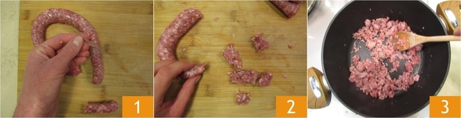 Para preparar los paquetitos, lo primero es ocuparse de la salchicha. Incide la tripa y extráela con cuidado 1. Luego, desmenuza groseramente la salchicha con las manos 2. Prepara el caldo de carne y mantenlo caliente. Transfiere los trozos de salchicha a una cacerola 3,