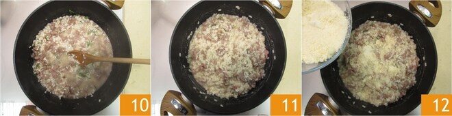 Continúa la cocción, añadiendo más caldo si es necesario y mezclando de vez en cuando para que no se pegue 10. Tan pronto como el arroz esté cocido, apaga el fuego 11, añade el parmesano 12