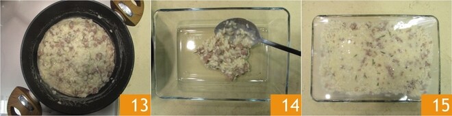 y remueve hasta obtener un risotto cremoso 13. Transfiere el risotto a una bandeja 14, extiéndelo bien para cubrir toda la superficie, cubre con film 15 y transfiere al frigorífico durante 30 minutos.