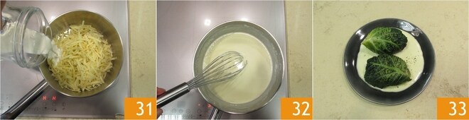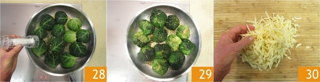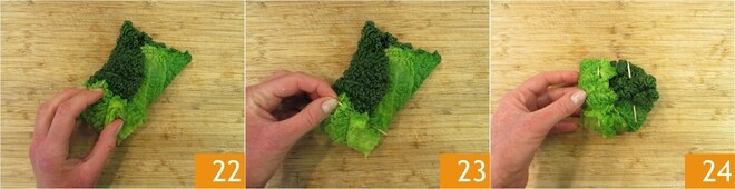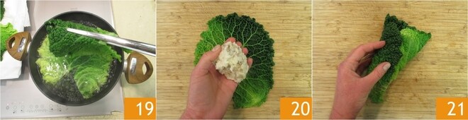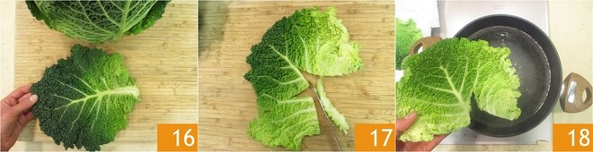 Mientras tanto, elige 12 hojas de col, lo suficientemente grandes e íntegras 16. Elimina si es necesario la parte fibrosa del centro, tratando de no romper la hoja 17. Escalda las hojas de col en abundante agua caliente 18, durante aproximadamente un minuto.