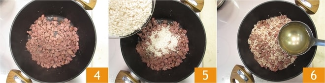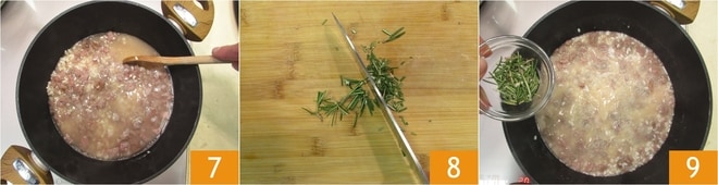 Cocina el arroz durante unos 25 minutos, continuando a añadir caldo cuando sea necesario 7. A la mitad de la cocción, pica una rama de romero 8 y agrégalo al risotto 9.