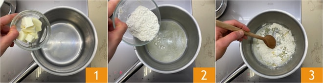 Para preparar los paquetitos de lasaña con calabacines, comience con la bechamel: en un cazo derrita la mantequilla 1, luego agregue la harina 2. Remueva rápidamente con una cuchara para que la mantequilla derretida absorba la harina 3.