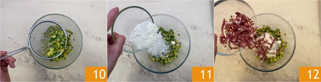 Una vez listos los calabacines, póngalos en un bol 10, sazone con el Parmigiano Reggiano DOP rallado 11 y el speck 12.