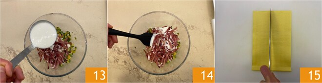 Incorpore un cucharón de bechamel 13 y mezcle para amalgamar el relleno 14. Ahora tome las láminas frescas de huevo: corte cada lámina a la mitad a lo largo con un cuchillo o una rueda para pizza 15.