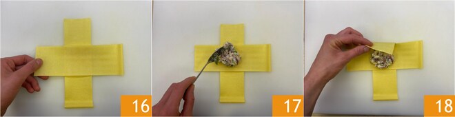 Superponga las dos tiras obtenidas en forma de cruz 16 y rellene el centro con una cucharada de relleno 17. Ahora cierre un extremo de la pasta hacia el centro comenzando desde la tira más externa 18.