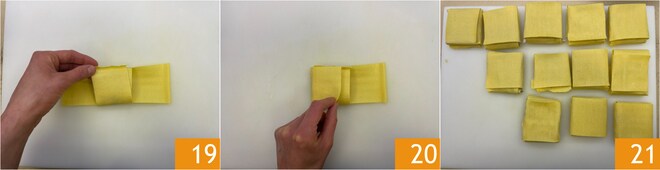 Superponga también el otro extremo más externo 19, luego superponga los dos extremos laterales restantes 20. Los paquetitos están listos, colóquelos en una bandeja con la unión hacia abajo 21.