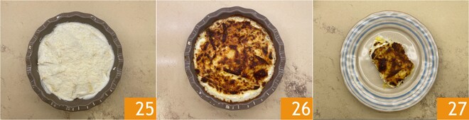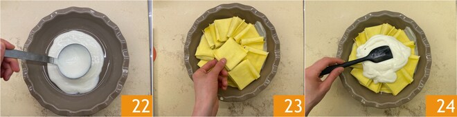 Tome una fuente para hornear, nosotros hemos utilizado un molde trapezoidal que mide 19 cm en la base y 23 cm en el borde. Vierta una capa de bechamel en el fondo 22, luego coloque los paquetitos en un sentido circular superponiéndolos ligeramente 23. Cubra con la bechamel restante 24.