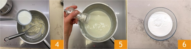 Ahora vierta la leche en hilo, continuando a remover con el batidor 4, de esta manera no se formarán grumos. Continúe la cocción a fuego moderado para espesar la salsa que deberá quedar ligeramente más líquida, salpimiente al gusto 5. Transfiera la bechamel a un bol y déjela enfriar 6.