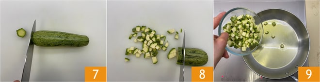 Ahora encárguese del relleno: lave y corte los extremos de los calabacines 7, luego córtelos en pequeños cubos 8. En una sartén caliente un chorrito de aceite de oliva virgen extra, añada los calabacines 9 y cocine durante 10 minutos a fuego moderado.